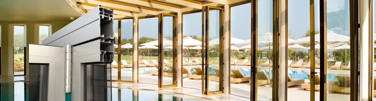 Фасади от алуминий и стъкло, с ефект “отворен простор”- системата позволява “хармоника” движение, което освобождава голяма част от отвора.