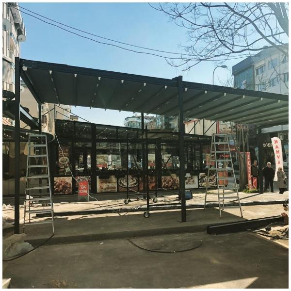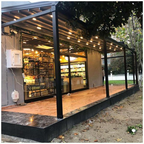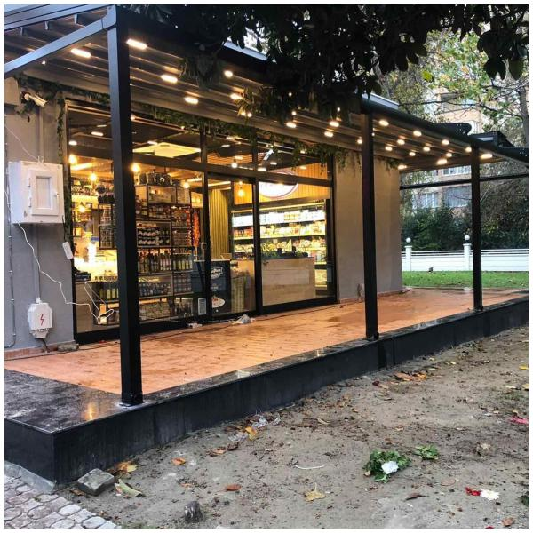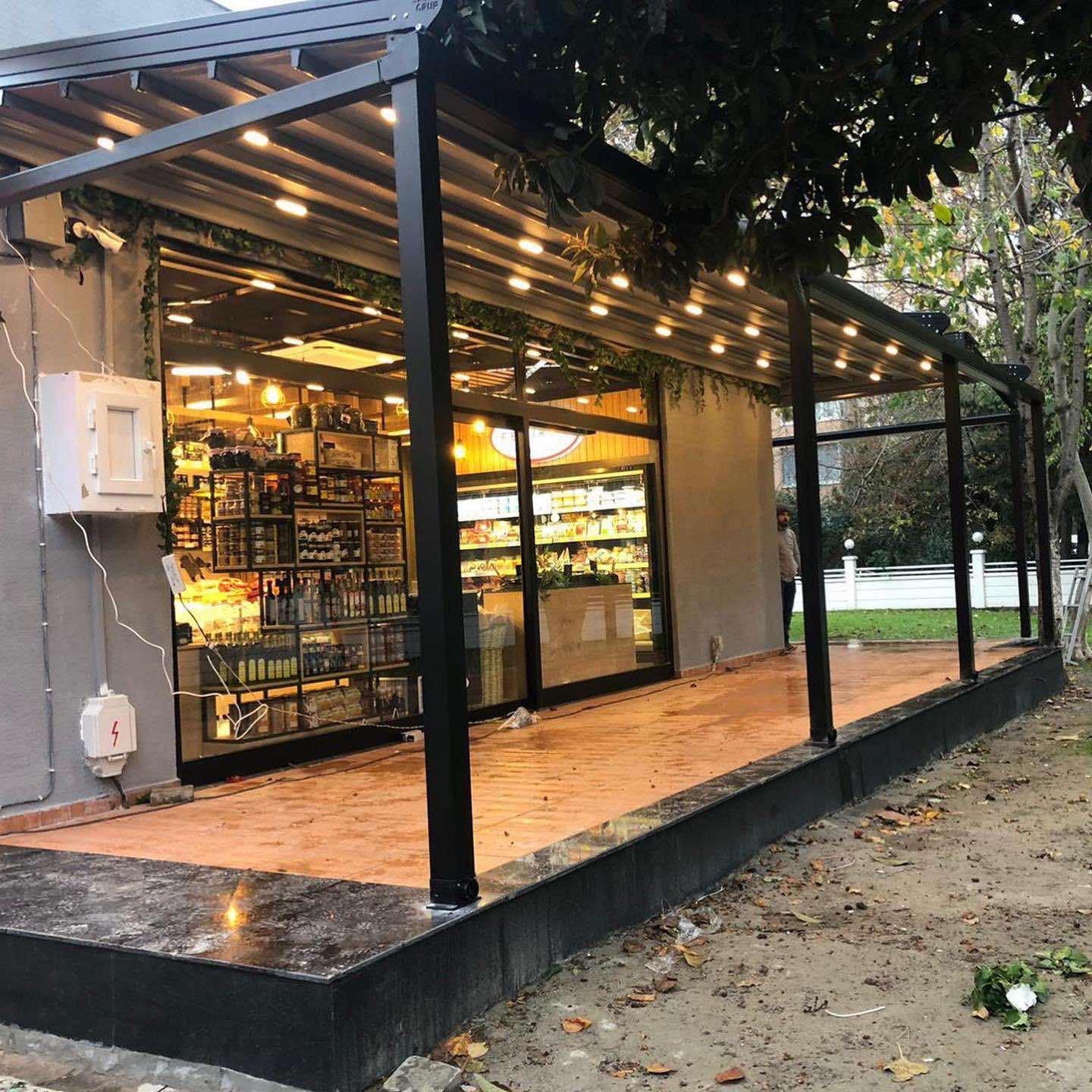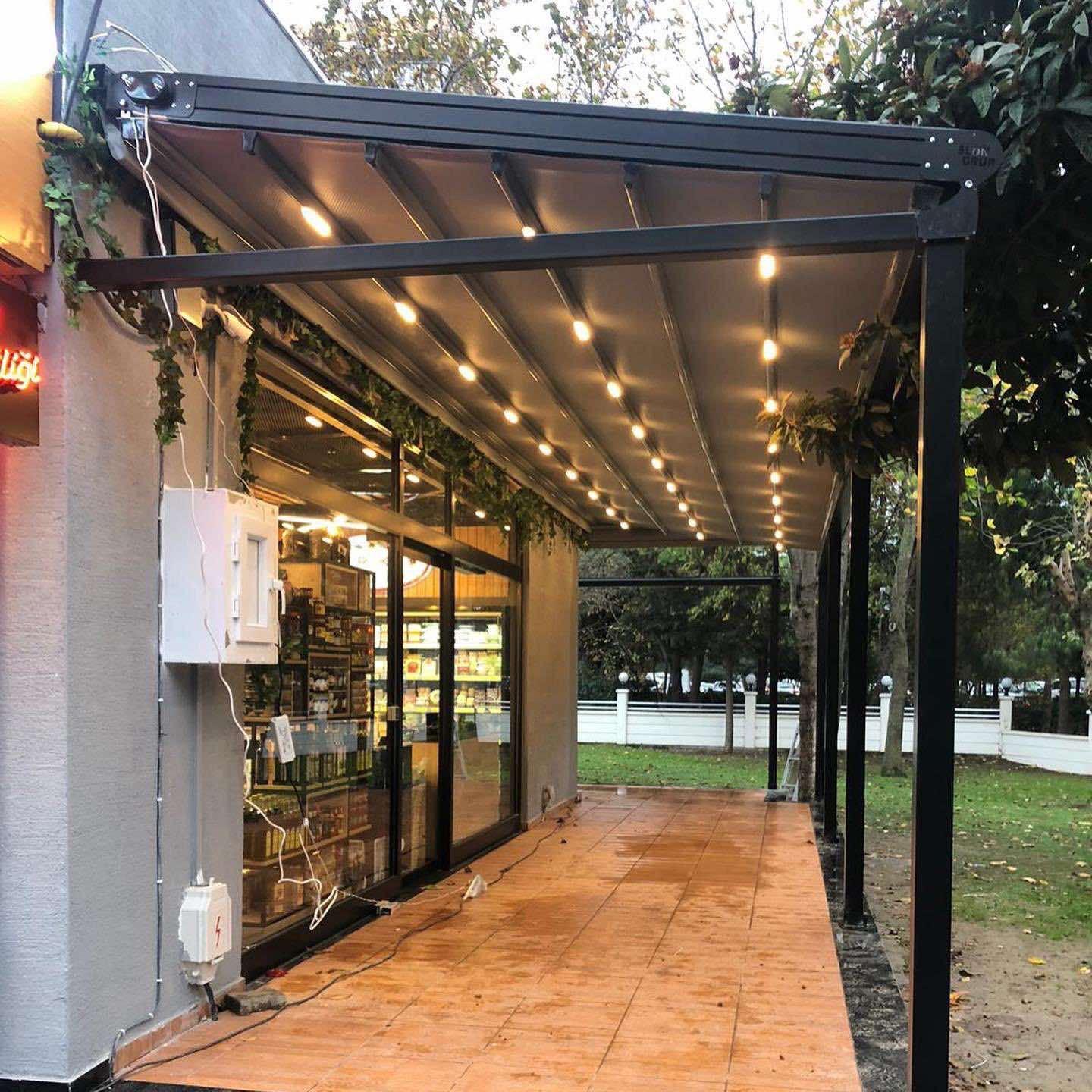 При обществени пространства или бизнес обекти, като покритие за външен офис, кафене, изложбена зона.
