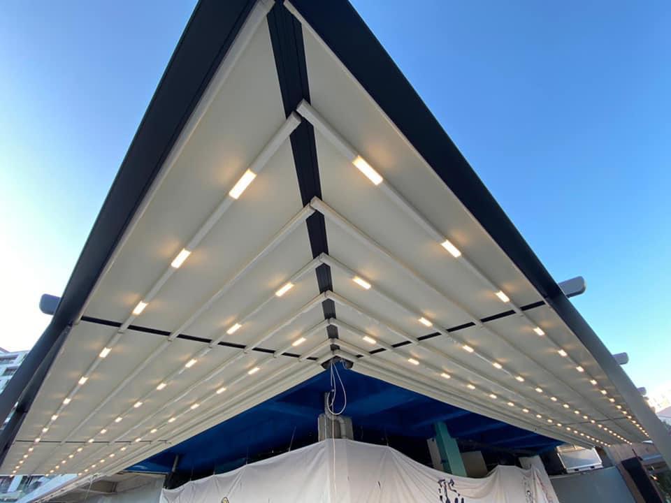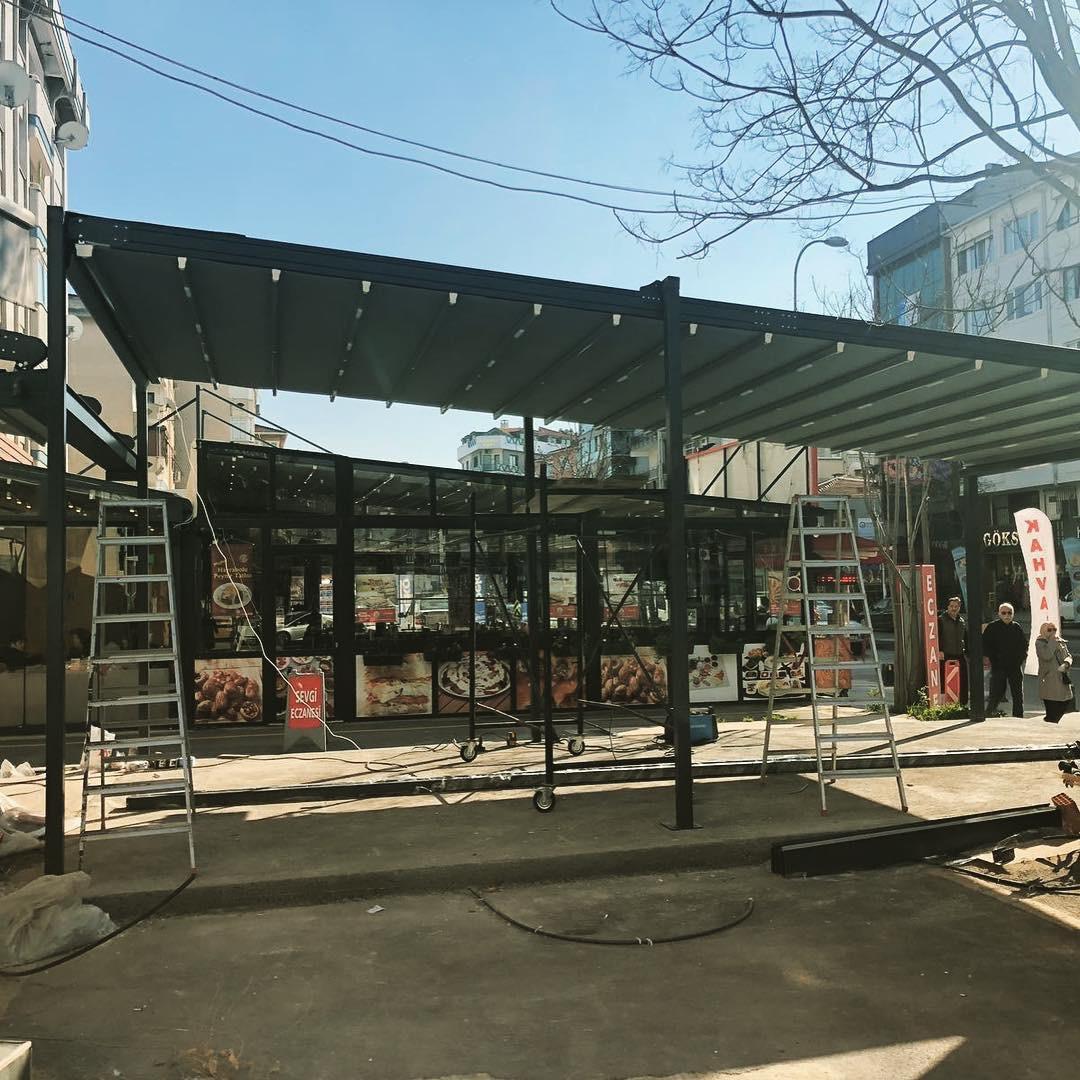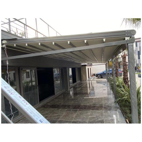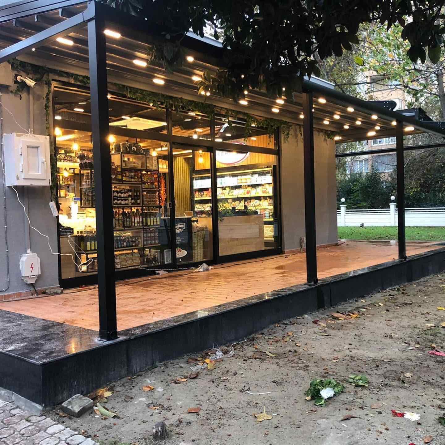 При обществени пространства или бизнес обекти, като покритие за външен офис, кафене, изложбена зона.