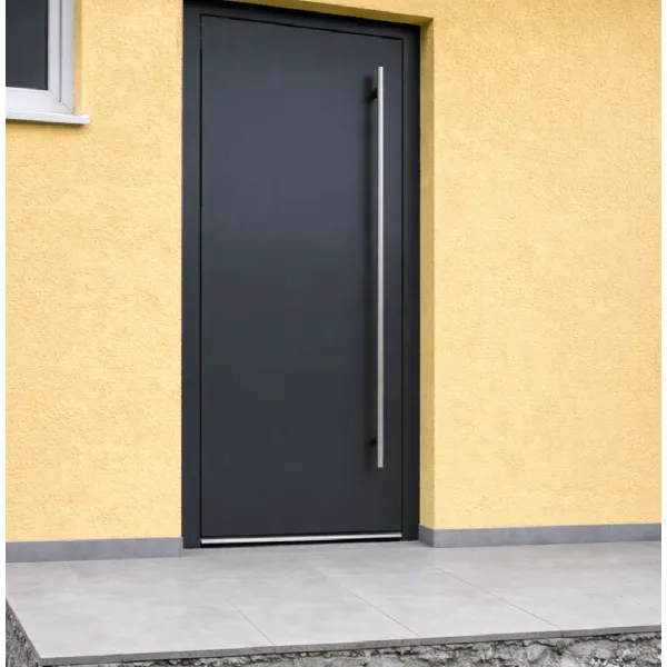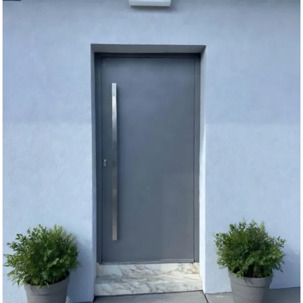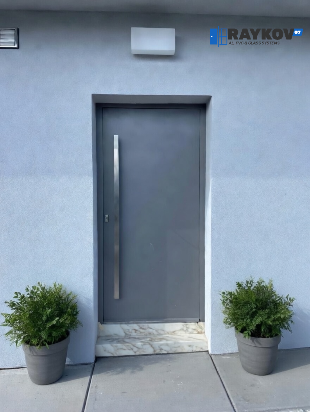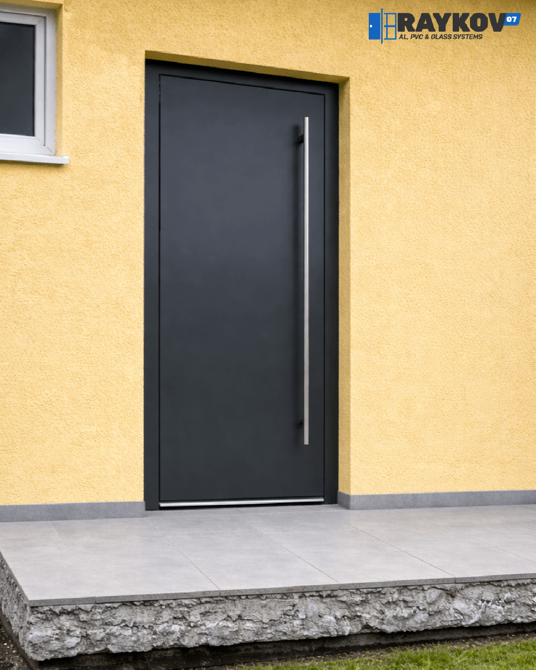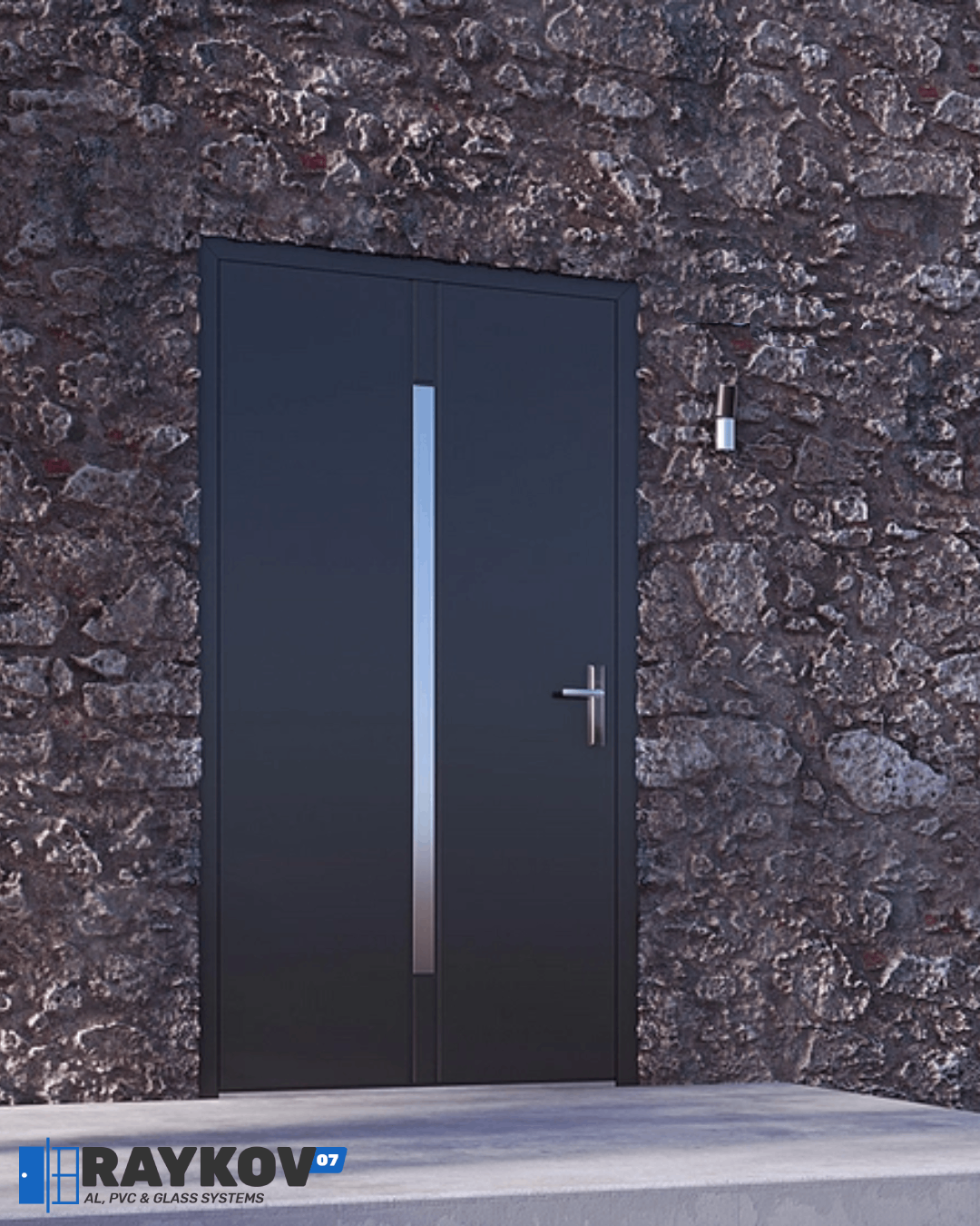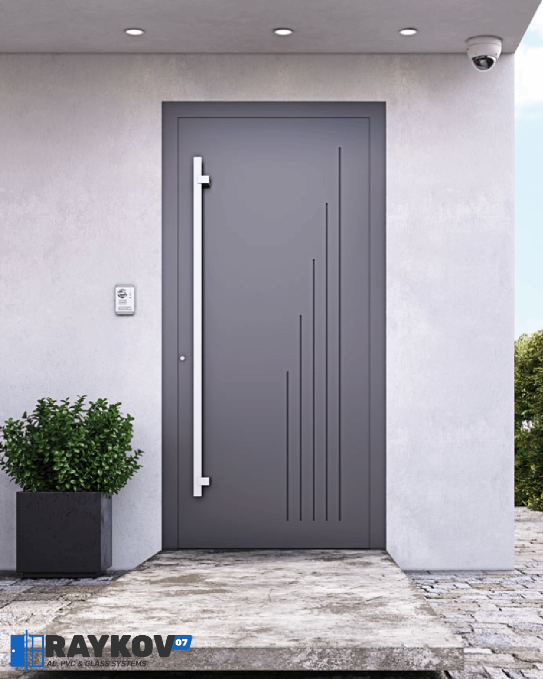 Конструкцията с прекъснат термомост осигурява добра топлоизолация и комфорт през всички сезони, а здравите алуминиеви профили гарантират устойчивост и дълготрайност. Вратата предлага отличен баланс между цена и качество, без излишно остъкляване, като поддържа високо ниво на сигурност и удобство при ежедневна употреба.