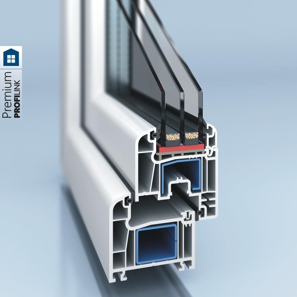 "PROFILINK Premium" е 5-камерна система с дълбочина на профила 70мм за производство на висококачествени PVC прозорци. Изпълнението "с изместени равнини" предлага много висок коефициент за топлопроводимост, а смесената геометрия от прави и заоблени линии допринася за изключително красив прозорец.