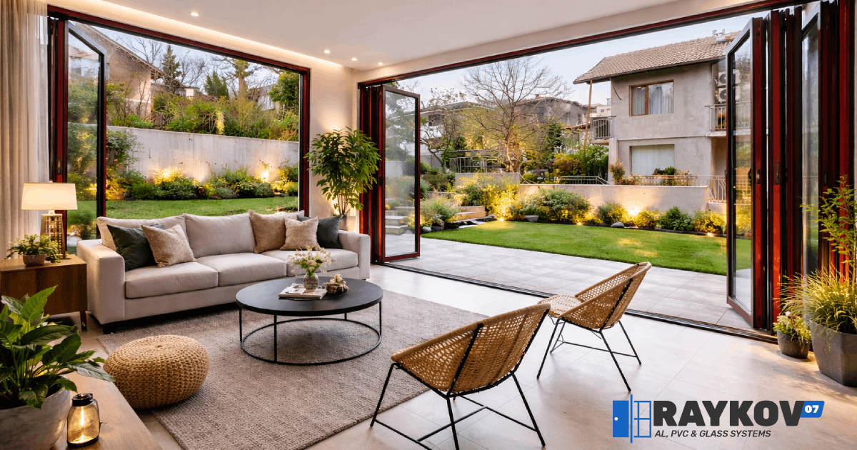 Системата за сгъваеми врати Reynaers CF77 от Raykov 07 отваря пространството и обединява до 8 крила в едно цяло. Резултатът? Повече светлина, свеж въздух и усещане за свобода – сякаш външният свят влиза директно във вашия дом.